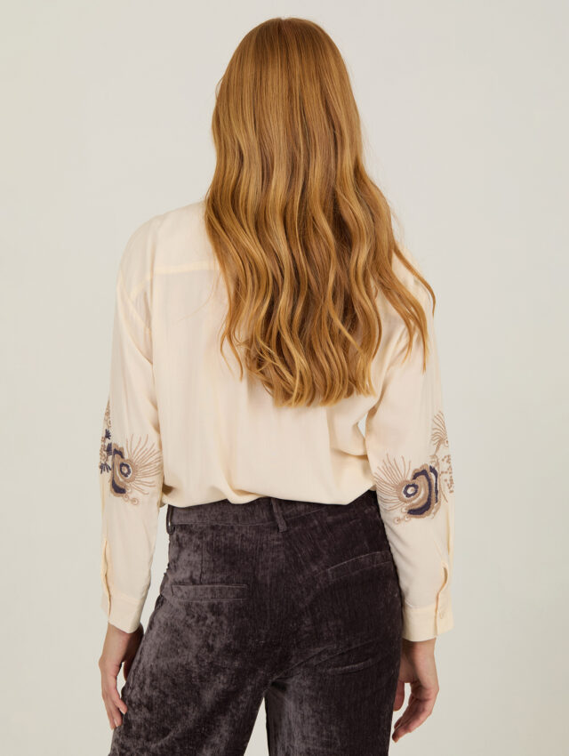 Camisa en tejido de viscosa bordada. Manga larga. Bordado a contraste. Cuello camisero con bordado de cruces.