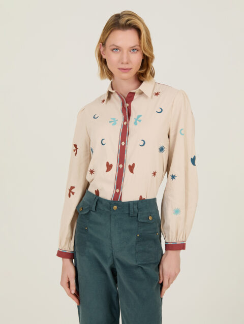 Camisa con motivos bordados a contraste. Manga larga ligeramente abullonada. Tapeta, puños y canesú a contraste. Botones a tono.