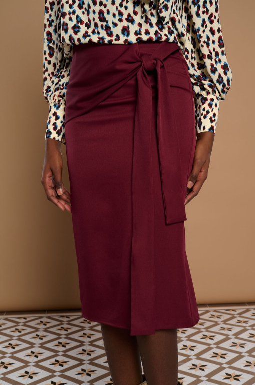 Falda midi con lazo en lateral. Color granate. Forro interior. Cierre con cremallera trasera oculta en costura.