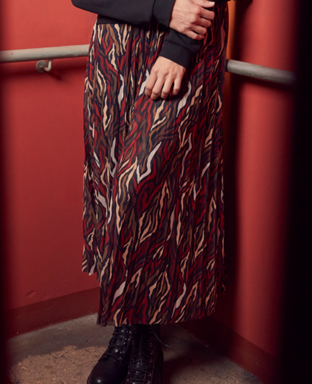 Falda de gasa midi plisada con estampado en diferentes tonos.. burdeos, crudo, verde..