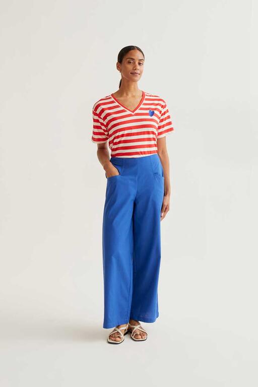 Camiseta con estampado de rayas blanco y rojo. Escote pico y manga corta. Hombro ligeramente caído. Detalle bordado de corazón en color azul.